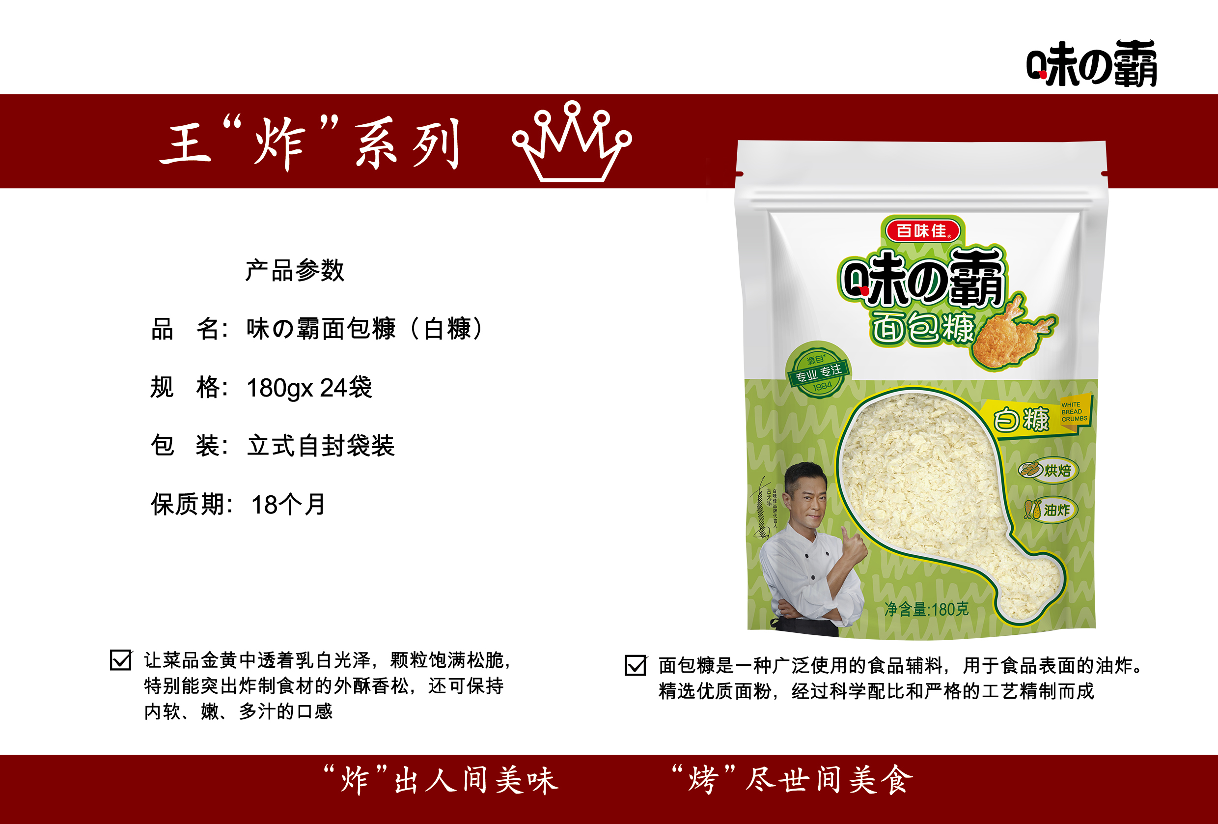 味の霸面包糠(白糠) 相關(guān)產(chǎn)品: 味の霸面包糠(白糠) 味の霸胡椒粉2016/07/08 味の霸香脆炸粉2016/07/08 味の霸香辣炸粉2016/07/08 味の霸蒜香炸粉2016/07/08 味の霸面包糠(黃糠)2016/07/08